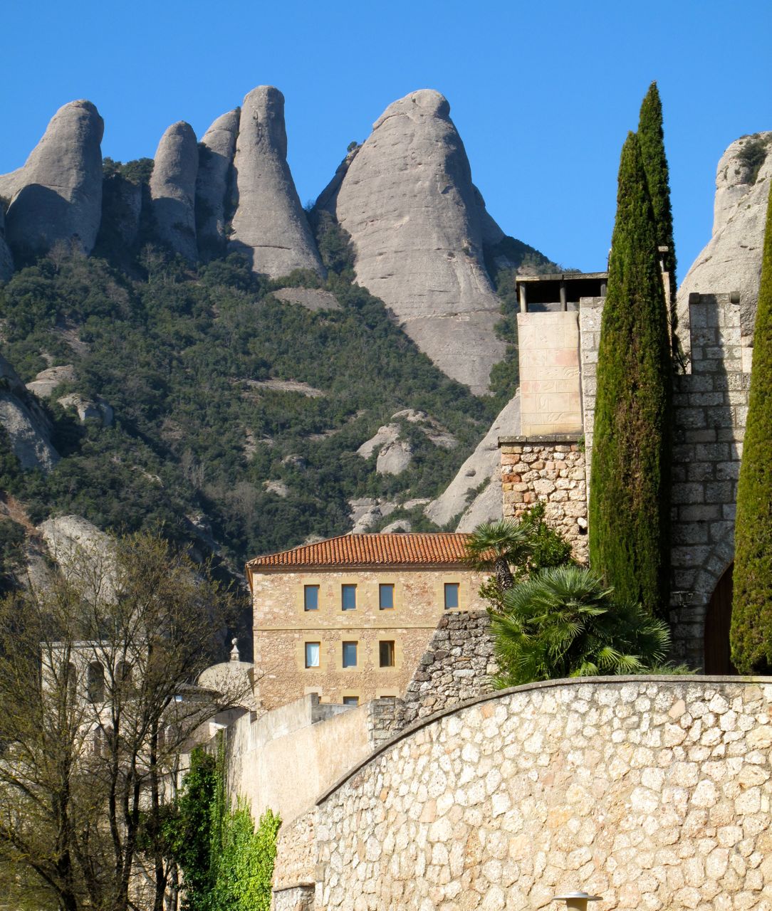 This was our last day of visiting Barcelona and was the first time we actually set an alarm to make sure we didn’t miss a minute. We headed off  on a tour bus in glorious sunshine to the fabled benedictine monastery of Montserrat. Once again we chose the tour alternative even though many reject this alternative as too touristy…we thought given our limited time we’d do it anyway. We found the winding road up the mountain exhilarating especially sitting on the mountain side seats so we didn’t have to look down the sheer cliffs.