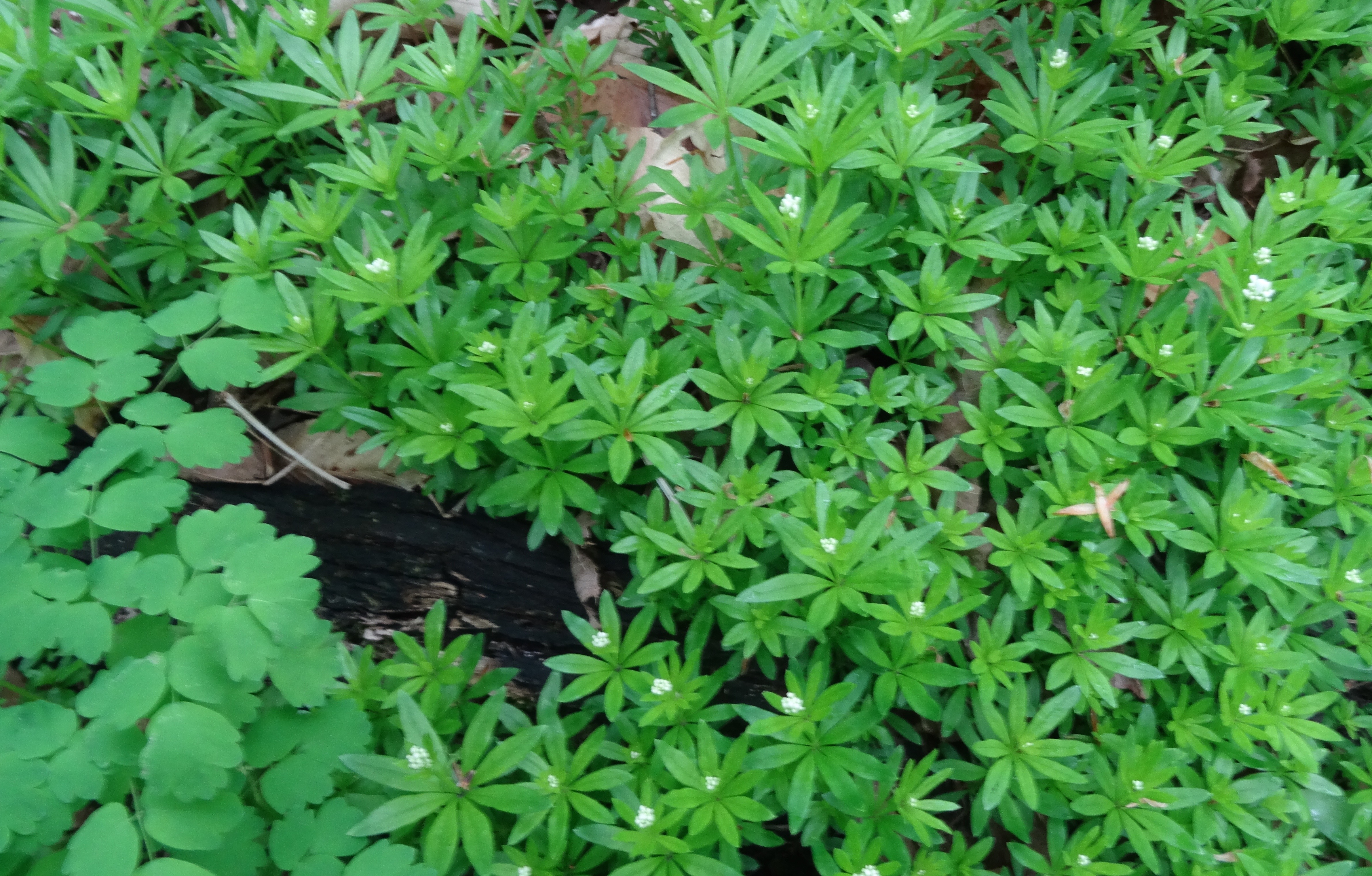 Patches of sweet woodruff also dot the forest floor and my hiking partner Cheryl and I look forward to a warmer spell which will release their delicate fragrance.